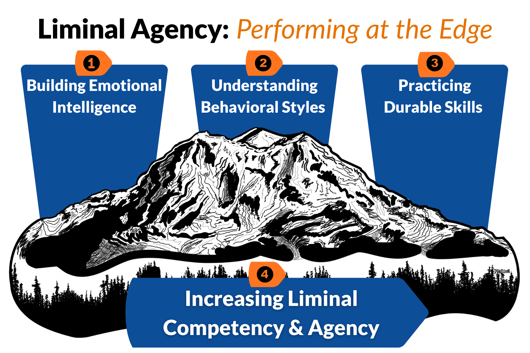 Liminal Agency™ is a developmental approach that helps individuals navigate the space between stimulus and response—between comfort and chaos, between now and…when? Participants learn to recognize emotions, understand behavior patterns, and practice deliberate action that strengthens relationships, trust, and performance.